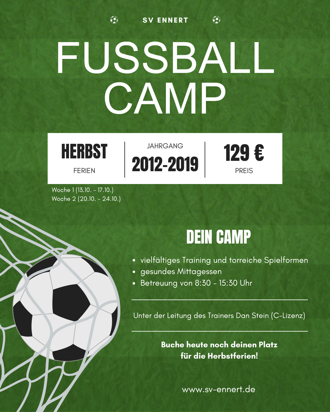 Du suchst ein sportliches Ferienerlebnis für dein Kind ab 6 Jahren? In unseren fünftägigen Feriencamps erwartet die Kinder ein abwechslungsreiches Trainingsprogramm, geleitet von lizenzierten Trainern, die nach den offiziellen Leitlinien des DFB arbeiten. Ob Anfänger oder Nachwuchskicker – jedes fußballbegeisterte Kind kann teilnehmen, auch ohne Vereinsmitgliedschaft!
